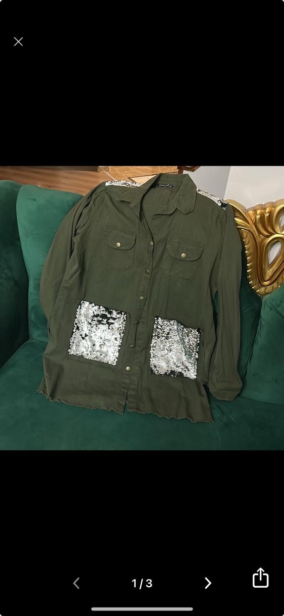 Haki renkli uzun ceket, bol kesim, düğmeli ve uzun kolludur. Notlu yaka, kamuflaj desen ve parlak payet ceplere sahiptir.