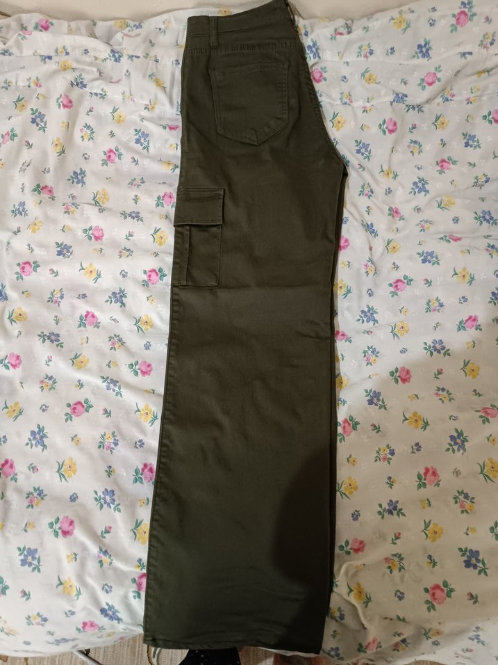 Kadınlar için haki renkli, kamuflaj desenli, kemerli günlük pantolon. Normal boy ve regular fit yapıda, sentetik kumaştan üretilmiştir.