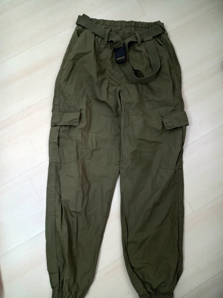 Kadınlar için kemerli, bol kesim ve koyu haki kamuflaj desenli kumaş pantolon. Sentetik kumaştan, midi boy ve cepli, outdoor sokak stili için uygun.