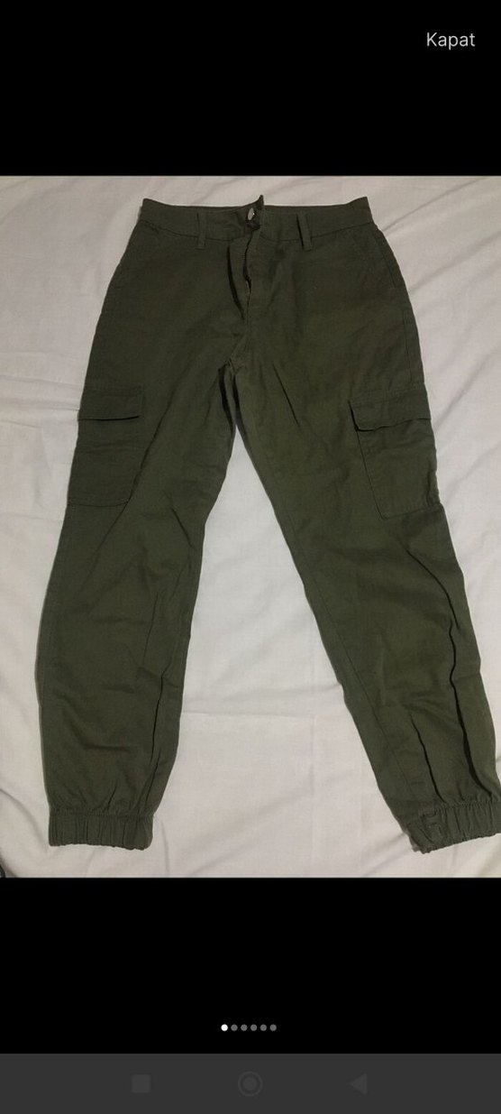 Sentetik kumaştan, midi boy, rahat kesim, elastik paçalı haki kamuflaj pantolon. Dış mekanlar için günlük ve zahmetsiz şık tarzda.