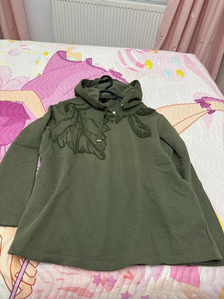 Kadınlar için uzun kollu, kapüşonlu ve düğmeli, rahat kesimli haki renk sweatshirt. Yumuşak ve sıcak kumaştan üretilmiş, desensiz ve günlük kullanım için uygundur.