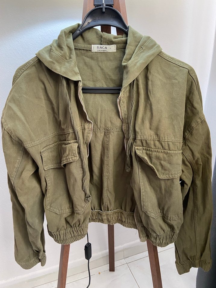 Bu kadın ceketi, keten kumaştan üretilmiş, bol kesim ve uzun kolludur. Notlu yaka ve düğmeli ön kısmı vardır. Normal midi boyda, haki renkte, günlük sokak stili için uygundur.