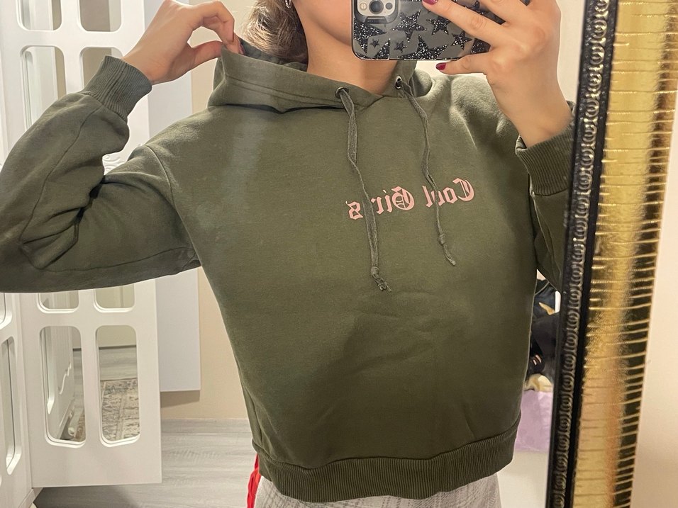 Kadın Haki Kapüşonlu Kısa Kollu Sweatshirt