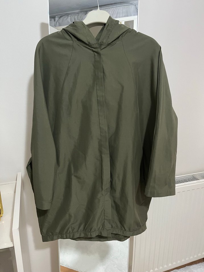 Kadınlar için haki renk kapüşonlu, uzun kollu, midi uzunlukta bol kesim yağmurluk. Sentetik kumaştan, günlük sokak stili için uygun drapeli tasarım.