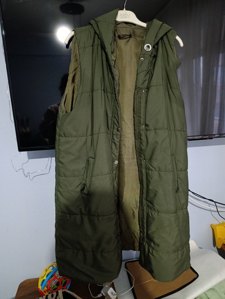 Kadın haki midi yelek, kapüşonlu ve fermuarlı ürünün kapson kısmındaki ip yok ve iç kısmındaki cep söküldü tadilat gorucek