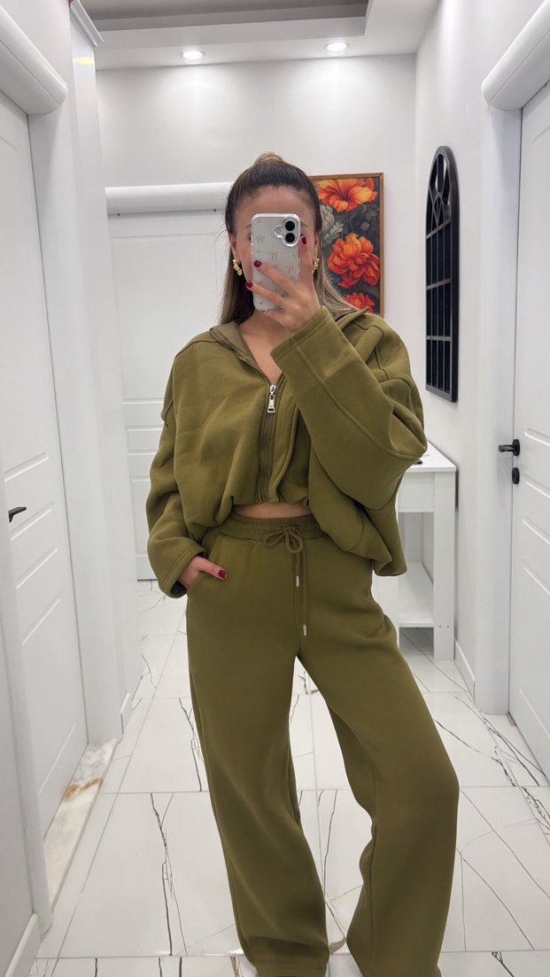 Kadın Haki Kapüşonlu Oversize Eşofman Takımı