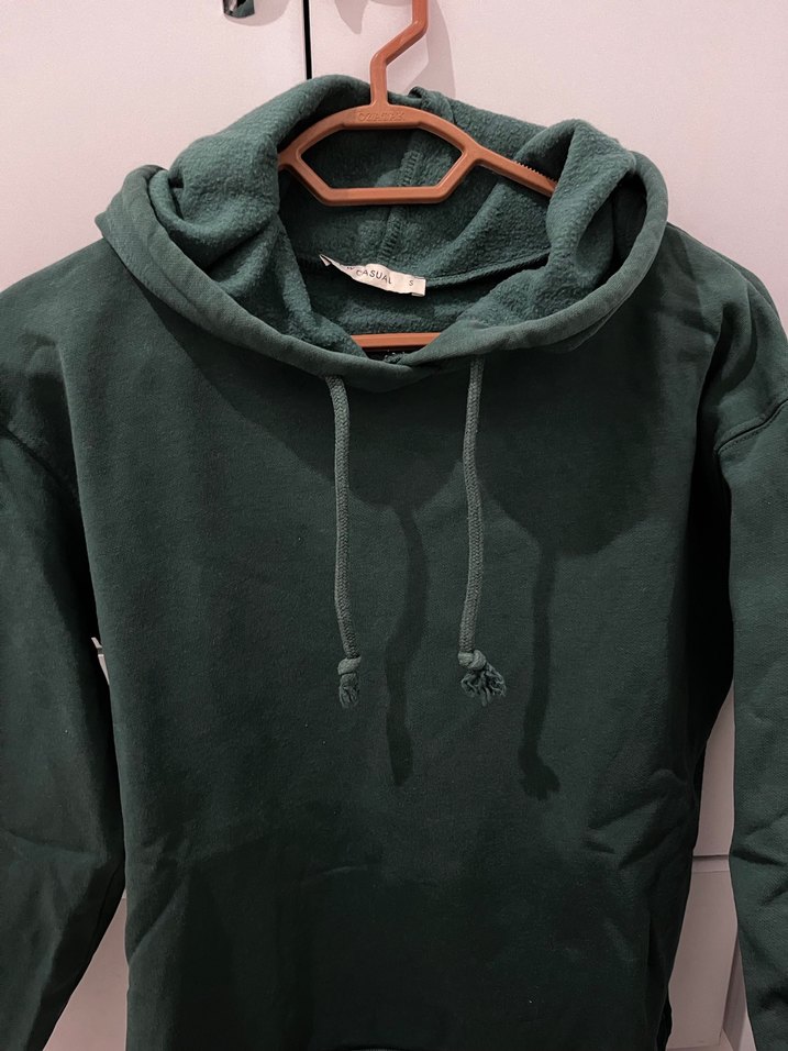 Kadınlar için uzun kollu, yuvarlak yakalı, bol kesim ve yumuşak sıcak kumaştan yapılmış koyu yeşil rahat sweatshirt. Günlük kullanım için zahmetsiz şıklık sunar.