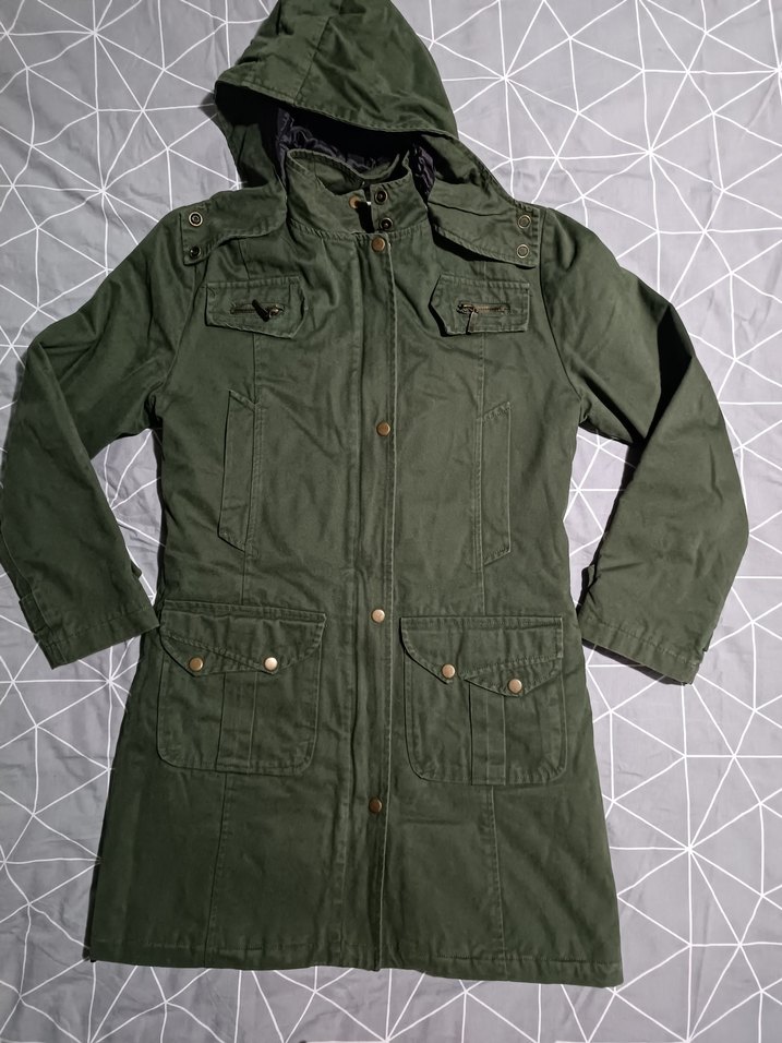 Kadınlar için haki renkli, düğmeli uzun ceket. Kapüşonlu, uzun kollu ve regular fit olup, Outdoor ve sokak stiline uygundur. beden ölçüsü XL yazıyor ama kalıbı dar o yüzden aşağıda vereceğim ölçüleri dikkate alınız lütfen.. göğüs: 48 cm boy : 83 cm