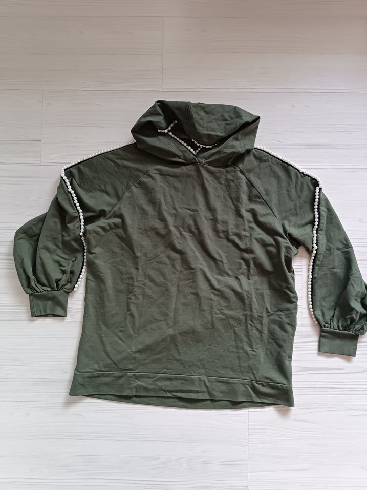 Kadın haki kapüşonlu uzun kollu sweatshirt, gevşek kesim ve dekoratif şeritlerle rahat bir stil sunar. Yumuşak keten kumaştan, günlük kullanıma uygun midi boyda.