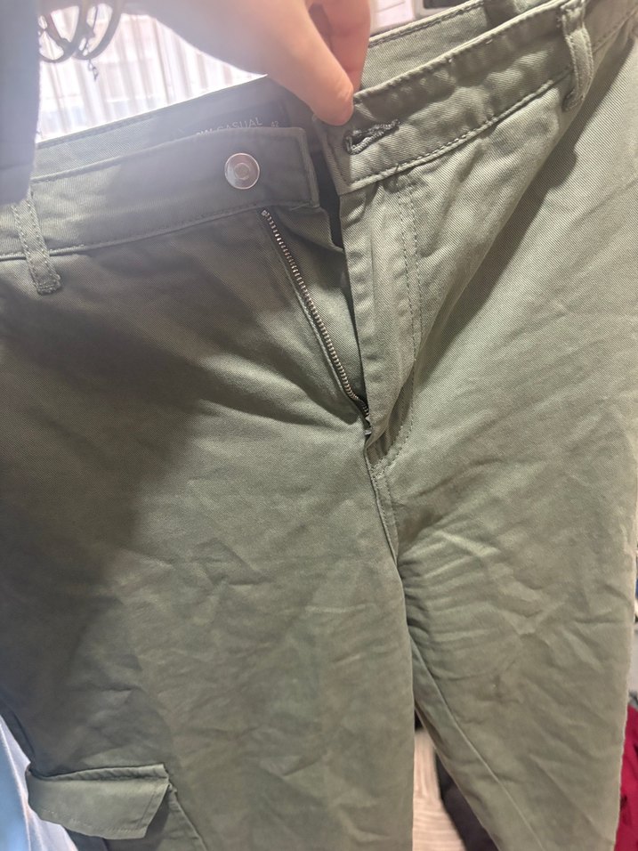 Kadınlar için haki renkli, fermuarlı, normal boy midi kesim, kumaş pantolon. Sokak stili ve günlük kullanım için uygun, desensiz ve trend görünümlü.