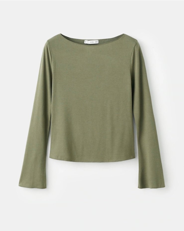 Kadın Haki Kayık Yaka Uzun Kollu Basic Bluz