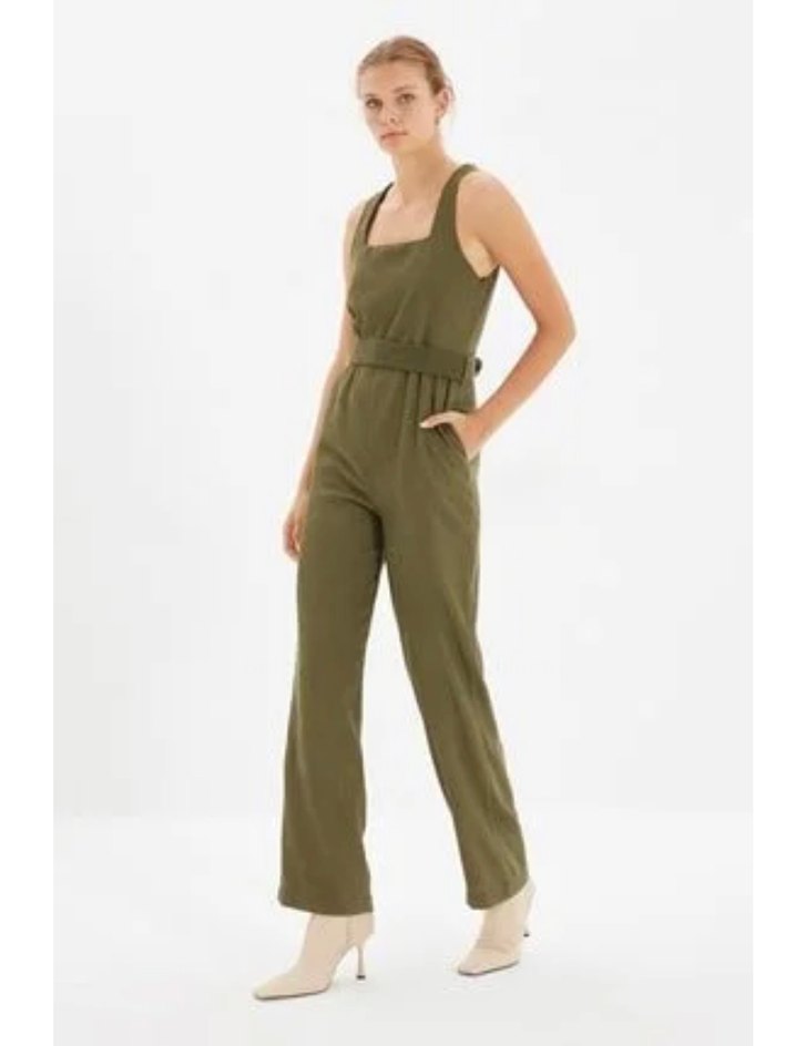 Kadınlar için kemerli, askılı ve regular fit tulum. Midi boy, askısız yakalı, düz desensiz ve haki renkte, sentetik kumaştan üretilmiştir.