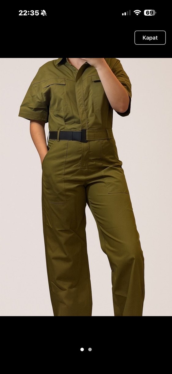 Kadınlar için kemerli, notalı yakalı ve kısa kollu tulum. Regular kesim, midi boy ve parlak haki kamuflaj deseni ile sentetik kumaştan üretilmiştir. Trendy casual sokak stili için uygundur.