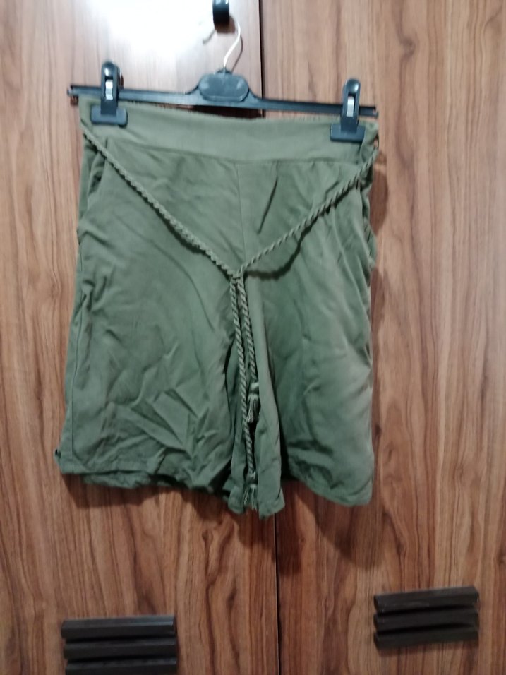 Kadınlar için kemerli, gevşek kesim mini şort. Yumuşak sentetik kumaştan, haki renkte, günlük dış mekan kullanımı için uygun.