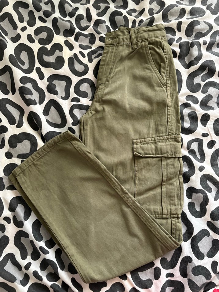 Kadınlar için rahat, kemerli, pamuklu haki kargo pantolon. Salaş kesimli, midi boy ve sokak stiline uygun.