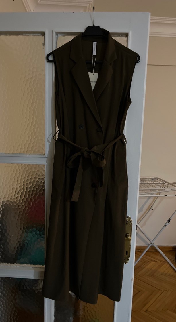 Kadın haki uzun kolsuz elbise , kemerli ve kolsuz tasarıma sahiptir. Notched lapel yakalı, viskon kumaştan üretilmiş, iş ortamına uygundur.