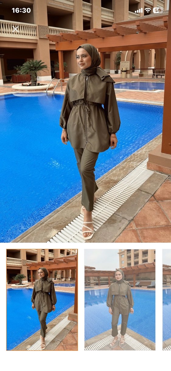 Kadın haki renkli, kemerli, yüksek yakalı ve askılı kollu uzun boy street wear takımı. Sentetik kumaştan, regular fit ve desen içermeyen günlük kullanıma uygun.