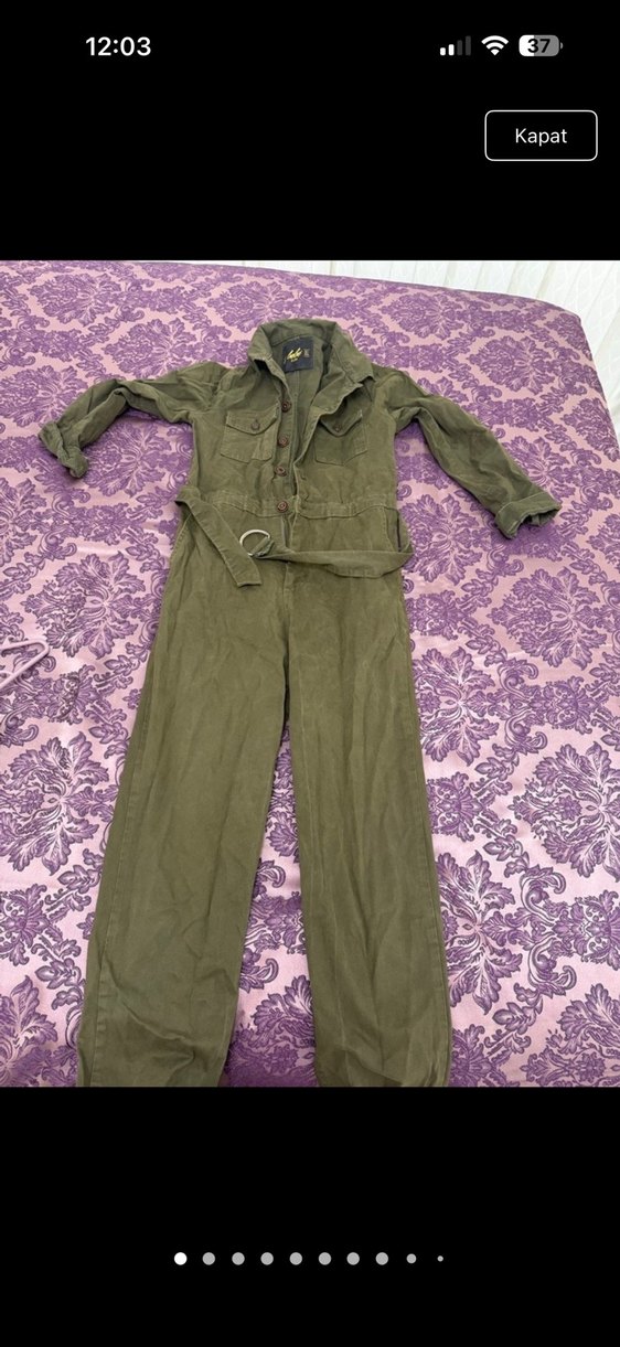 Kadınlar için kemerli, uzun kollu, haki renkli ve kamuflaj desenli uzun tulum. Notlu yaka ve vücuda oturan kesimiyle günlük kullanıma uygundur.