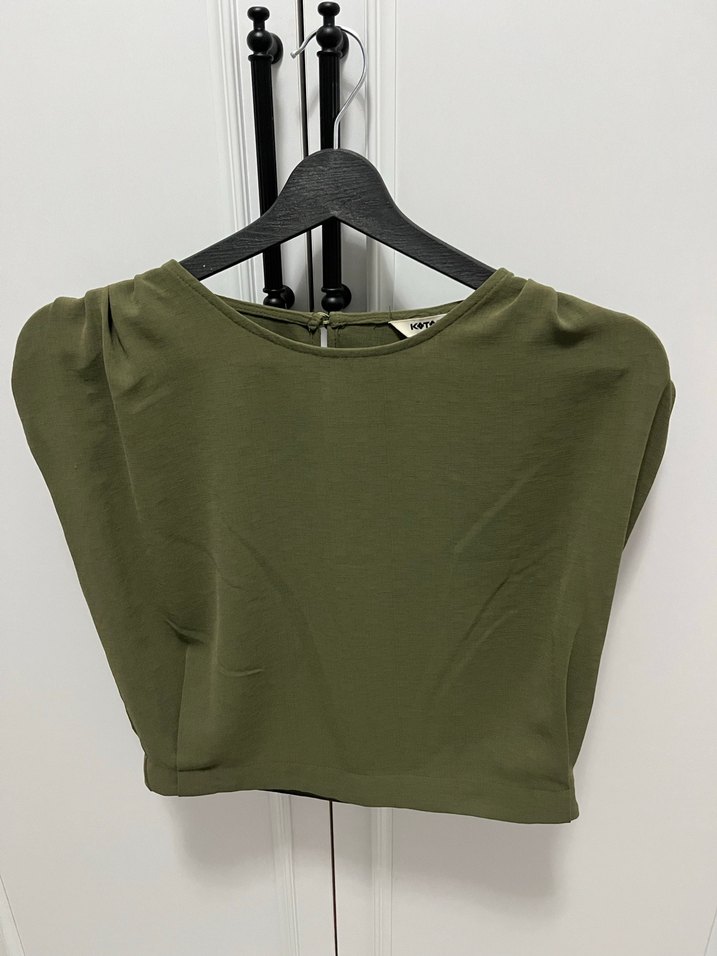 Kadınlar için haki renk keten kumaştan yapılmış, yuvarlak yaka ve kısa kollu, rahat kesim basic bluz. Günlük sokak stiline uygun sade tasarım.