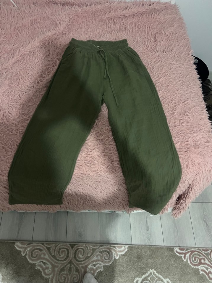 keten kumaştan, rahat kesim, midi boy haki pantolon, günlük kullanıma uygun