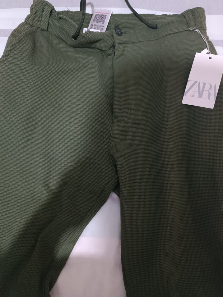 Zara marka, fermuarlı, bol kesim, haki yeşil keten kumaştan midi boy kadın pantolon. Günlük rahat kullanım için uygundur.