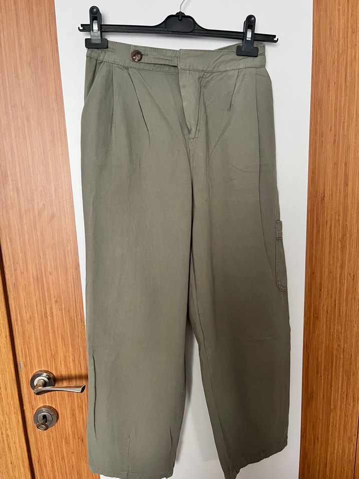 Bol kesim, haki renk keten pantolon, sade ve günlük kullanıma uygun tarzda.