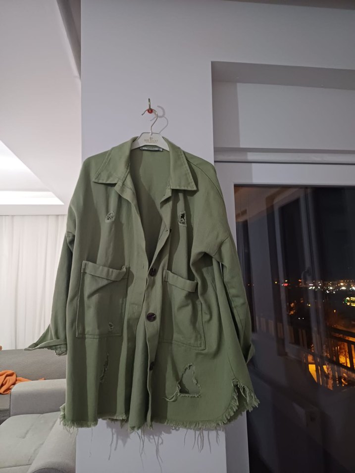 Salaş kesim, keten kumaştan yapılmış haki renk kadın ceket. Uzun kollu, düğmeli ve notched yaka detaylı, midi boyda sade tasarım.