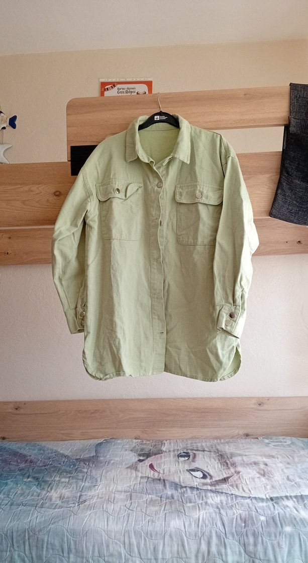 Salaş kesim, uzun kollu, düğmeli haki keten gömlek. Notlu yaka ve normal midi uzunluk ile günlük rahat sokak stili için uygun.
