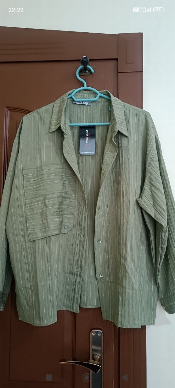 Haki renkli, keten kumaştan, düğmeli ve uzun kollu, normal boy midi gömlek. Salaş kesimi ve kesimli yaka detayıyla günlük rahat kullanıma uygun.