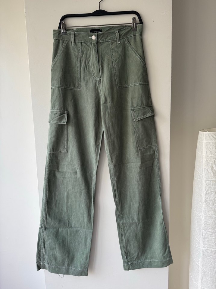 Kadınlar için keten kumaştan, geniş paça ve midi boyda haki renk pantolon. Rahat kesimi ve cepleriyle günlük kullanım için uygundur.