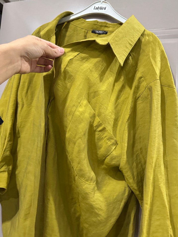 Bu kadın gömleği, bol kesim, uzun kollu ve kesik yakalıdır. Parlak haki ketenden üretilmiş, düğmeli ve normal midi boydadır, minimalist sokak stili için uygundur.