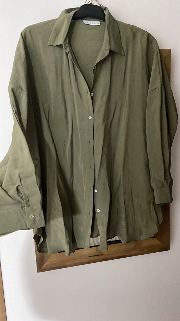 Kadınlar için keten kumaştan yapılmış, düğmeli, salaş kesim ve uzun kollu haki gömlek. Normal midi boyda, minimal ve desensiz tasarımla günlük kullanıma uygundur.