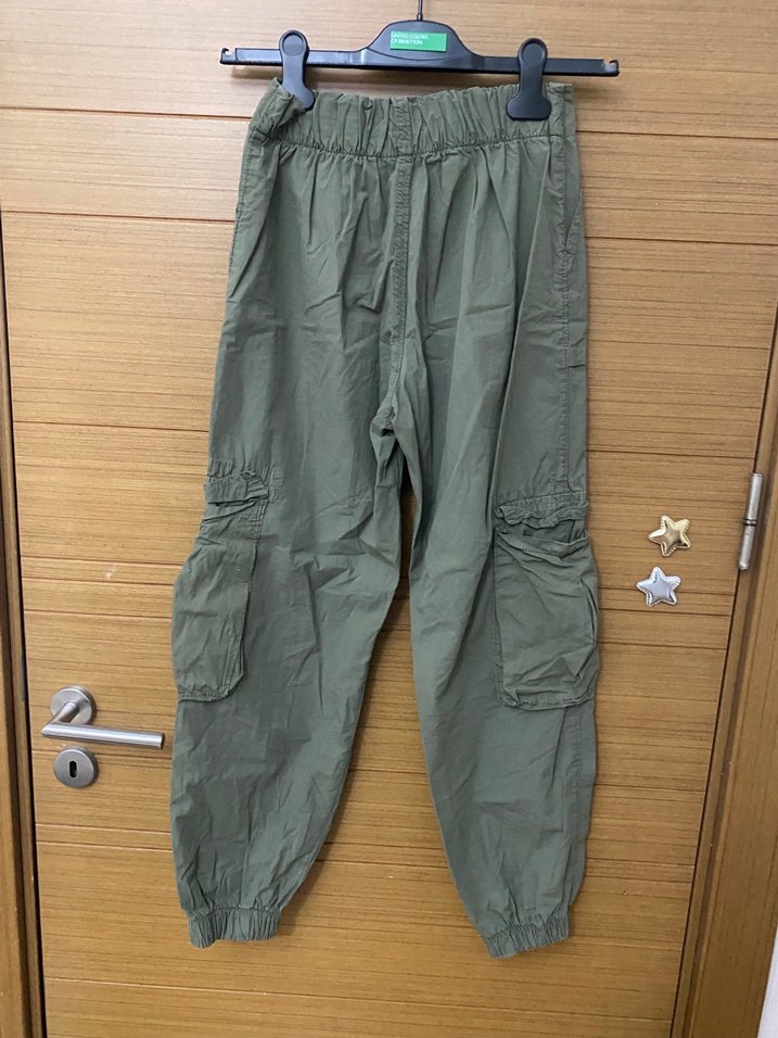 Kemerli ve lastikli paçalı, rahat kesim haki keten kadın pantolon. Günlük açık hava kullanımı için uygundur. Trendy ve konforlu tarz.