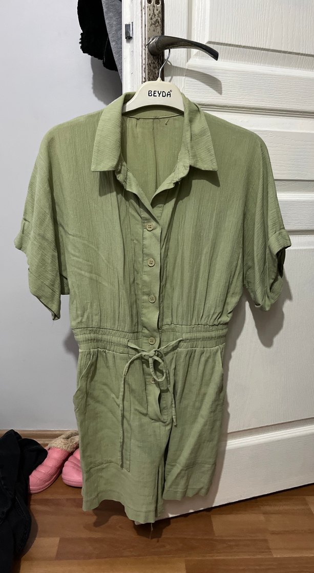Kadın Haki Keten Kısa Kollu Tulum