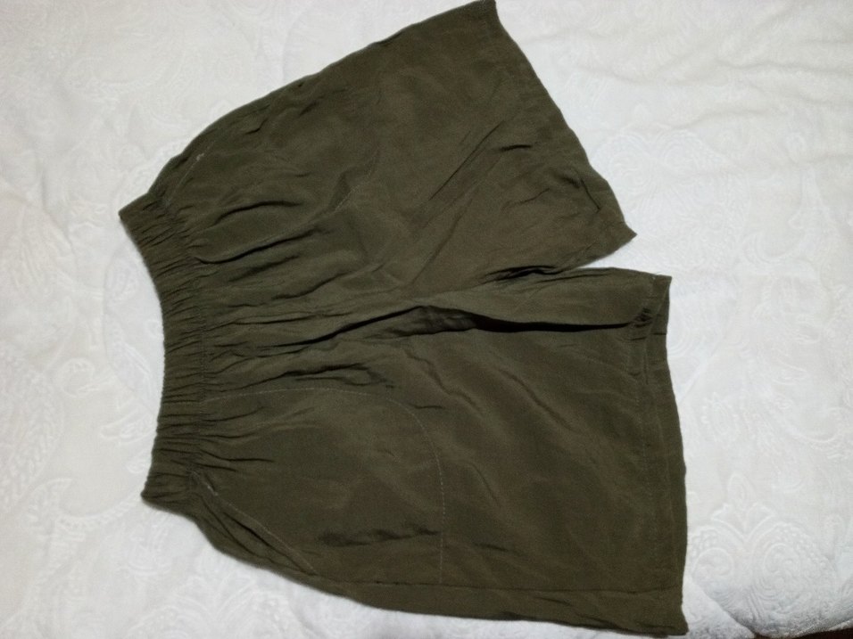 Kadınlar için haki renk keten kumaştan, bol kesim ve drapeli midi boy şort. Minimalist sokak stili ve dış mekan kullanımı için uygundur.