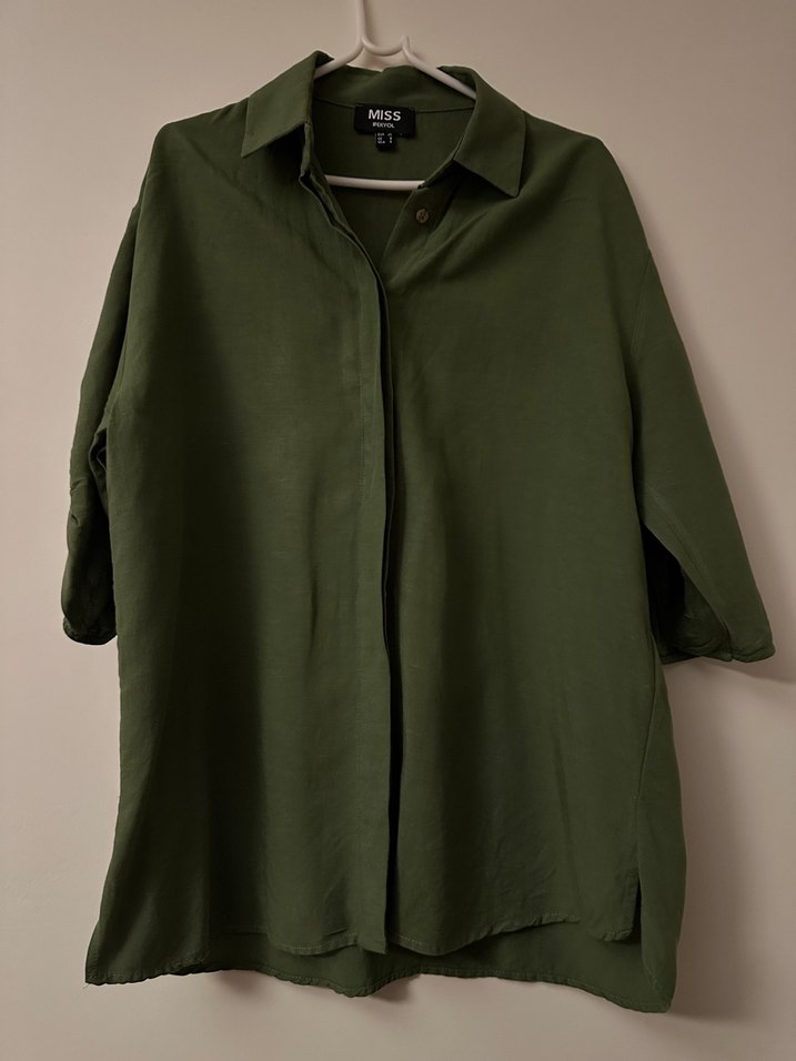 Kısa kollu, notched lapel yakalı, keten kumaştan yapılmış, bol kesim haki renk midi gömlek. Düğmeli ve günlük kullanıma uygun. Marka: MSS.