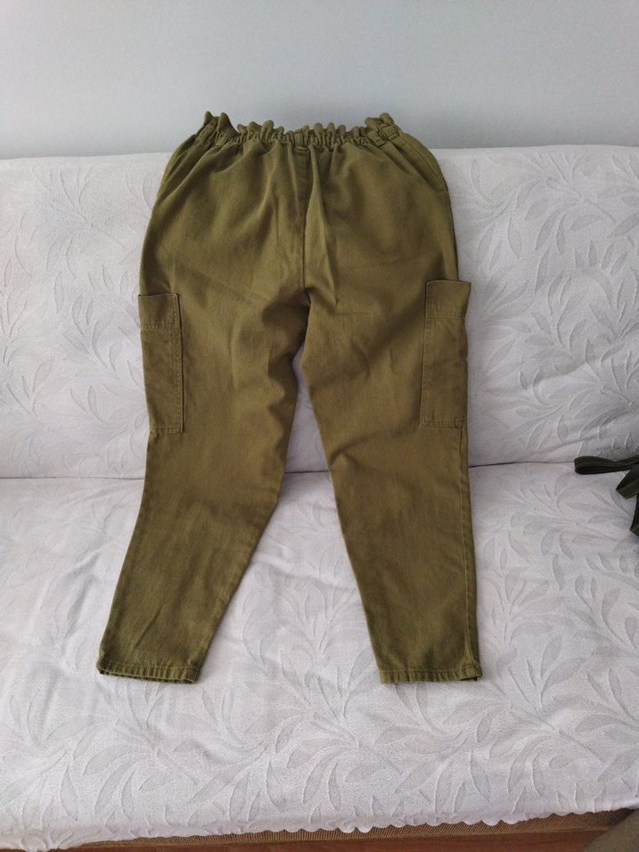 Kadınlar için haki keten kumaştan, kemerli ve bol kesim midi uzunluğunda rahat pantolon. Günlük ve sokak stiline uygun.