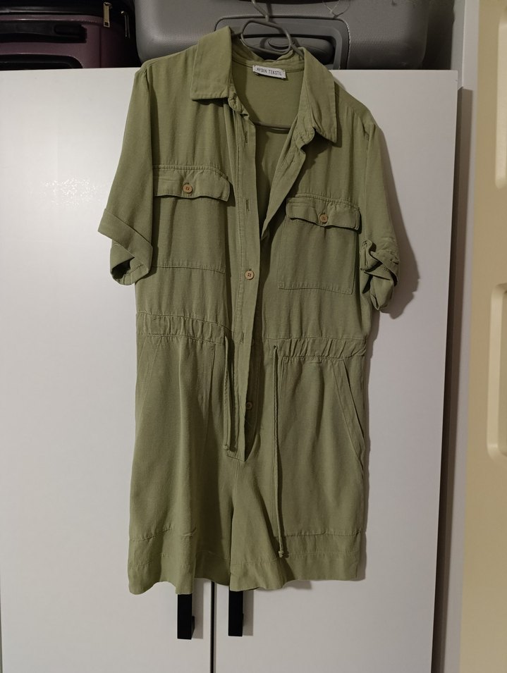Düğmeli ön ve kısa kollu, bol kesim haki keten tulum. Yaka detayı ve iki cep bulunur, gündelik sokak stili için uygun.