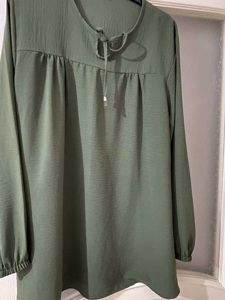 Kadın keten midi tunik, yuvarlak yaka ve bol kesimlidir. Haki renkte, uzun kollu ve düğmeli detaylarıyla sade, bohem bir tarz sunar. Günlük kullanıma uygundur.
