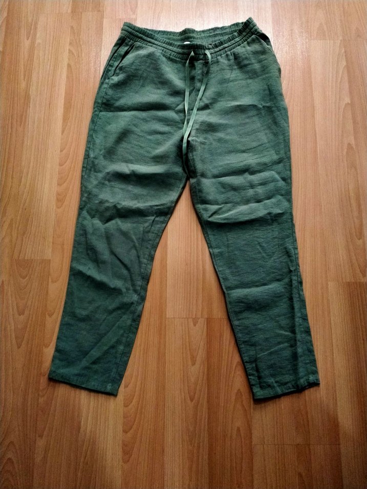 Kadınlar için haki renk, keten kumaştan pantolon. Günlük kullanım için rahat ve şık bir sokak stili sunar.