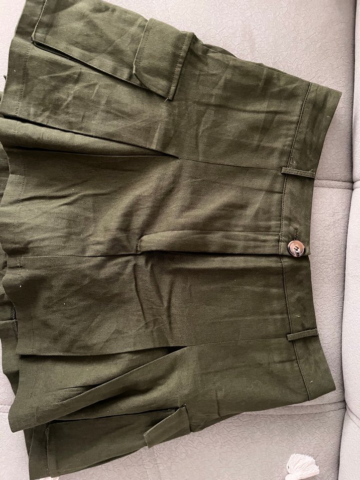 Hafif keten kumaştan, pileli ve yan cepli gevşek kesim haki mini etek, günlük sokak stili için uygundur. Arkası da etek görünümlüdür.