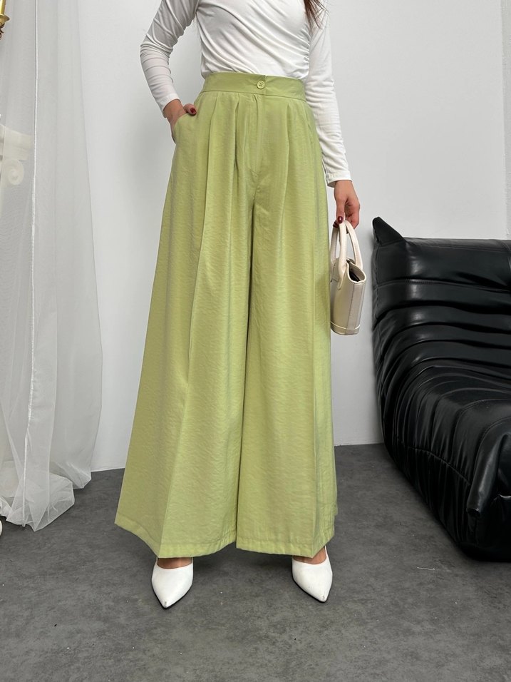 Kadın haki keten bol kesim, pilili, uzun pantolon. Minimalist ve normcore tarzda, gündelik kullanım için uygundur.