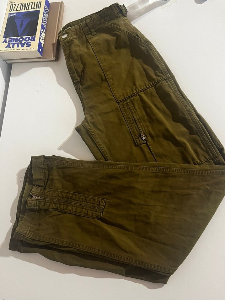 Kadın haki keten kumaştan, rahat kesim ve fermuarlı detaylara sahip, eski swzon zara pantolon hic bir sikintisi yok indirim yapilabilir