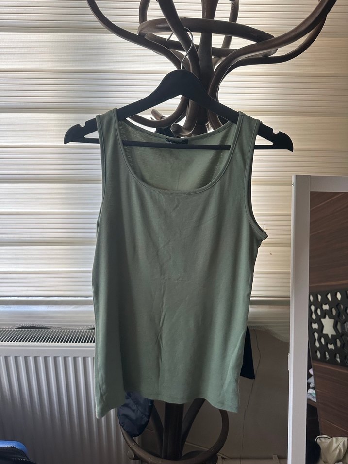 Kolsuz, keten kumaştan yapılmış haki renkli, yuvarlak yaka ve salaş kesim kadın atlet. Minimalist, desenli olmayan günlük kullanım için uygun.