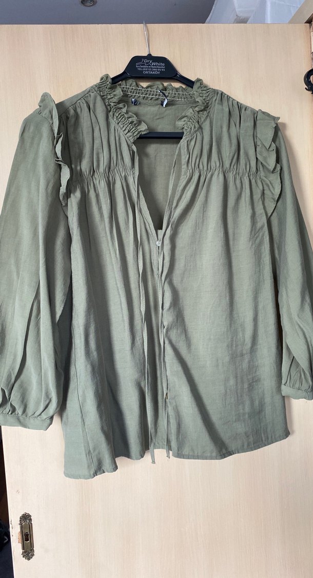 Haki renkte, yumuşak keten kumaştan, salaş kesim kadın gömlek. Uzun kollu, düğmeli ve fırfırlı V yaka detaylı, bohem tarz için uygun.