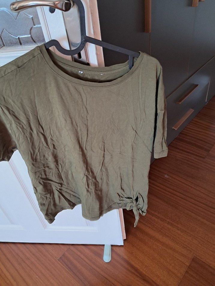Keten kumaştan, kısa kollu ve yuvarlak yakalı haki renk salaş tişört. Yan tarafında bağlama detayı bulunur, günlük rahat stil için uygundur.