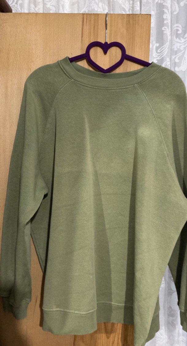 Kadınlar için yuvarlak yakalı, uzun kollu ve bol kesim keten sweatshirt. Pastel haki renginde, günlük kullanıma uygun sade ve normcore tarzda.