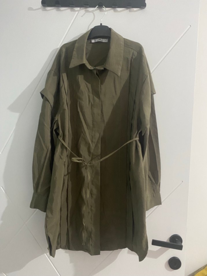 Kemerli ve bol kesimli, uzun kollu haki keten trençkot. Notlu yaka detayıyla minimal ve şık bir görünüm sunar.