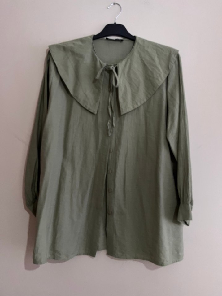 Bu kadın gömleği, geniş yakası ve bağcıklarıyla kollu yakaya sahip, keten kumaştan yapılmış rahat kesimli uzun kolludur. Haki renkte, düğmeli ve midi boydadır.