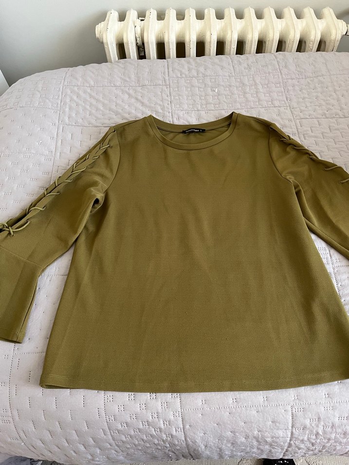 Kadın haki uzun kollu, yuvarlak yaka ve rahat kesim normcore tarzda günlük kullanıma uygun bluz.